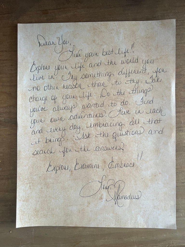 Explore your life and the world you live in. Try something different for no other reason than to try. Take charge of your life. Do the things you’ve always wanted to do. Find your own adventures. Live in each and every day, embracing all that it brings. Ask the questions and search for the answers.