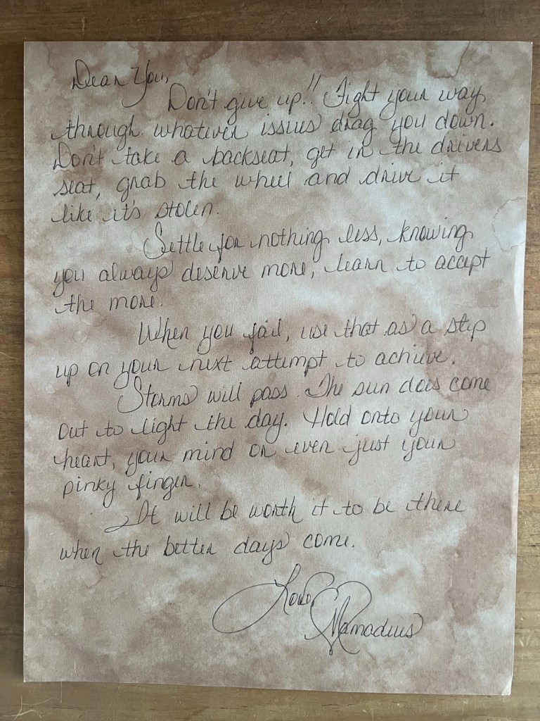 Don’t give up!! Fight your way through whatever issues drag you down. Don’t take a backseat, get in the drivers seat, grab the wheel and drive it like it’s stolen.