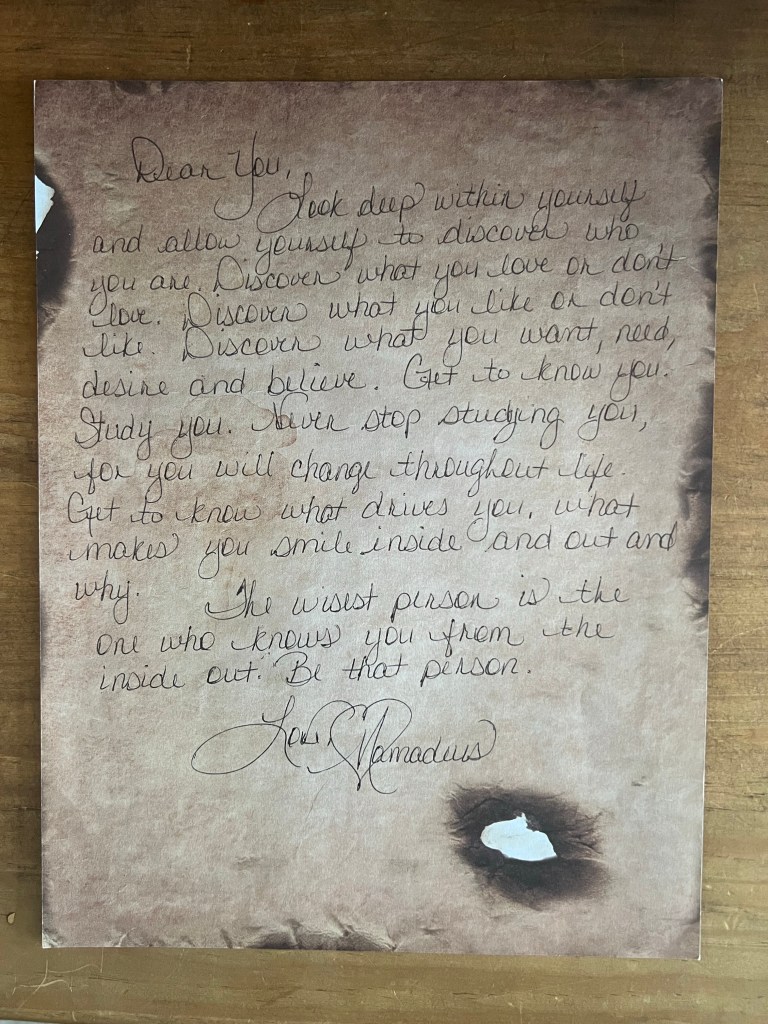 Look deep within yourself and allow yourself to discover who you are. Discover what you love and don’t love. Discover what you like and don’t like. Discover what you want, need, desire,and believe. Get to know you. Study you. Never stop studying you, for you will change throughout life. Get to know what drives you, what makes you smile inside and out and why.