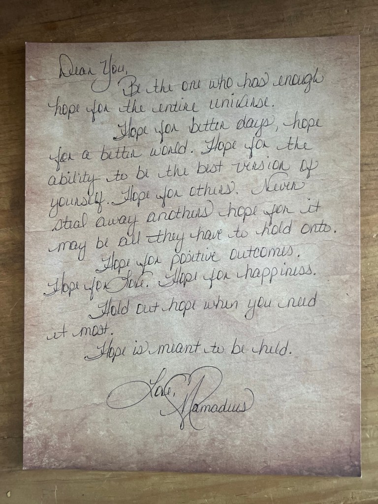 Be the one who has enough hope for a better world. Hope for the ability to be the best version of yourself. Hope for others. Never steal away another’s hope for it may be all they have to hold onto.